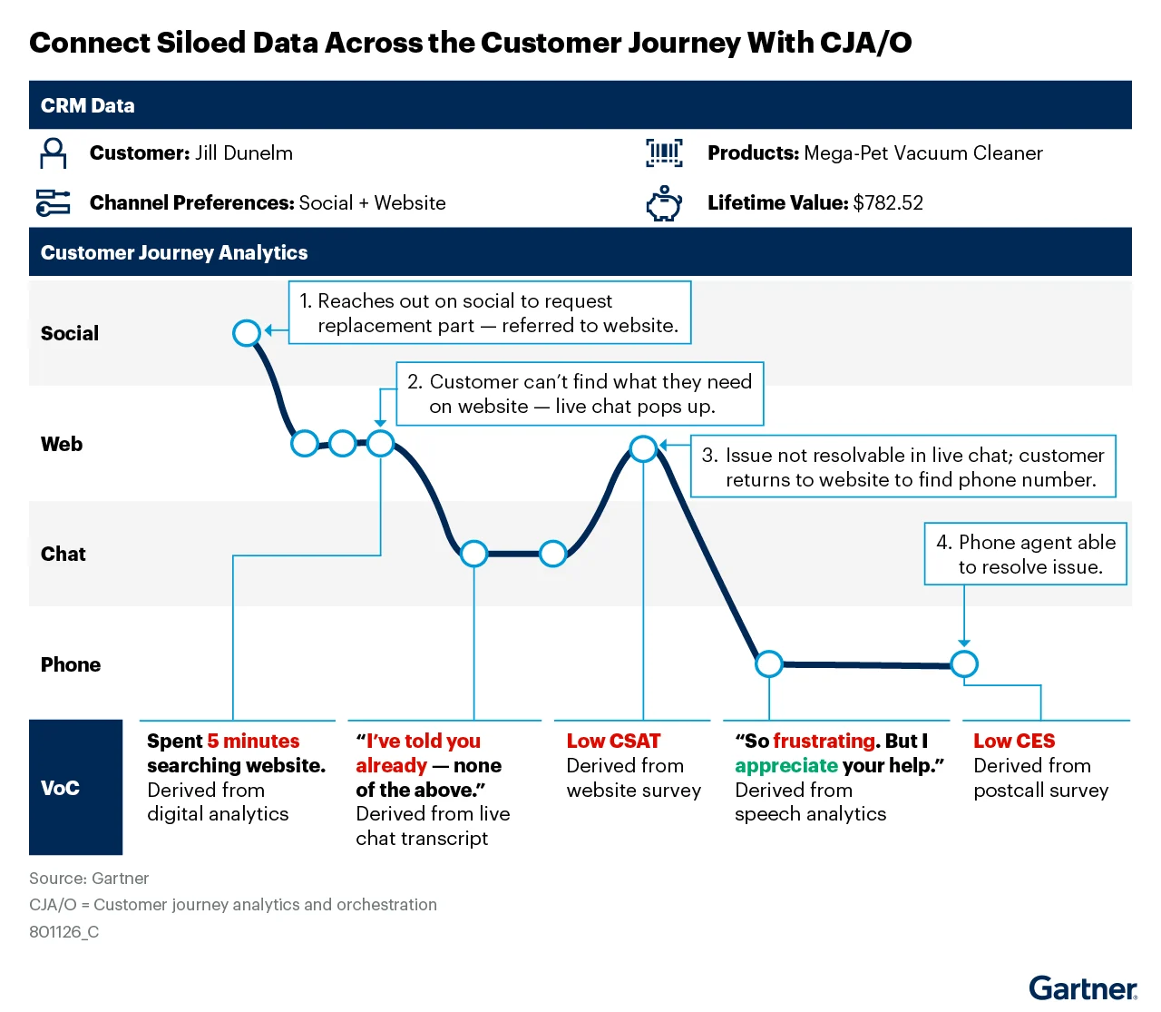 CJA/O systems connect event data from siloed systems and channels to help visualize customer journeys, tracking customer interactions across channels (see figure below). Overlaying voice of the customer (VoC), customer profile and transactional data provides more insight, such as customer sentiment. In this example, CJA reveals that Jill couldn’t get the information she needed from the website and live chat—and she felt frustrated and dissatisfied until the phone agent assisted her.